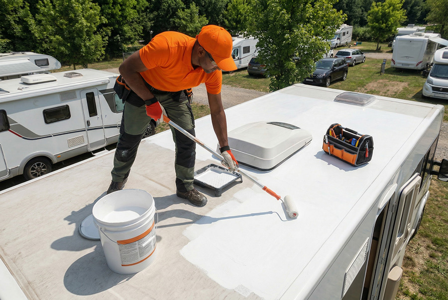 We use coatings, tapes, and sealants compatible with RV membranes and designed to flex with road movement and temperature changes.